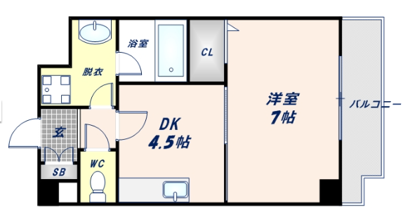 ダイニングキッチンは4.5畳とコンパクトですが、小さめのテーブルを置くことで食事や作業スペースとして十分活用できます。料理好きの方には、作業スペースを工夫して調理器具を置くことも可能。引き戸で洋室と仕切られているため、来客時には独立した空間としても使用でき、生活動線の効率も良好です。洋室は7畳あるので、ベッドやソファーを置いても余裕があり、自由にレイアウトできます。