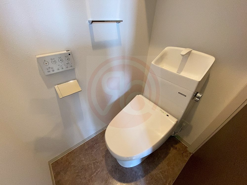 トイレのドアは開閉しやすい引き戸仕様で、廊下や居室の動線を邪魔せず、省スペースでスマートな設計。温水洗浄便座付きで機能性も高く、清潔感のある快適な空間に仕上がっています。シンプルでありながらも生活に欠かせない設備がしっかり整っており、来客時にも安心です。