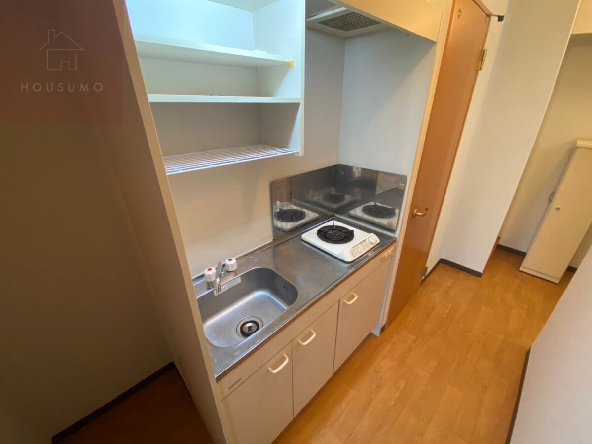 1口ガスコンロ付きのシンプルなキッチンは、調理スペースもしっかりと確保され、料理の効率を考慮した作りになっています。下部収納や調理スペースも確保されており、冷蔵庫や電子レンジを置くスペースも十分です。キッチンには換気扇があり、調理中の蒸気や匂いもスムーズに排出できます。一人暮らし初心者や自炊は最低限でOKという方にもぴったりの、コンパクトながら実用的なキッチンです。