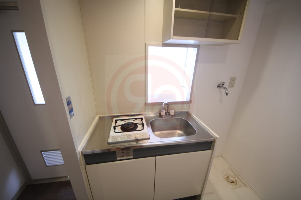 キッチンは1口ガスコンロを備えた省スペースタイプで、調理スペースはありませんが、