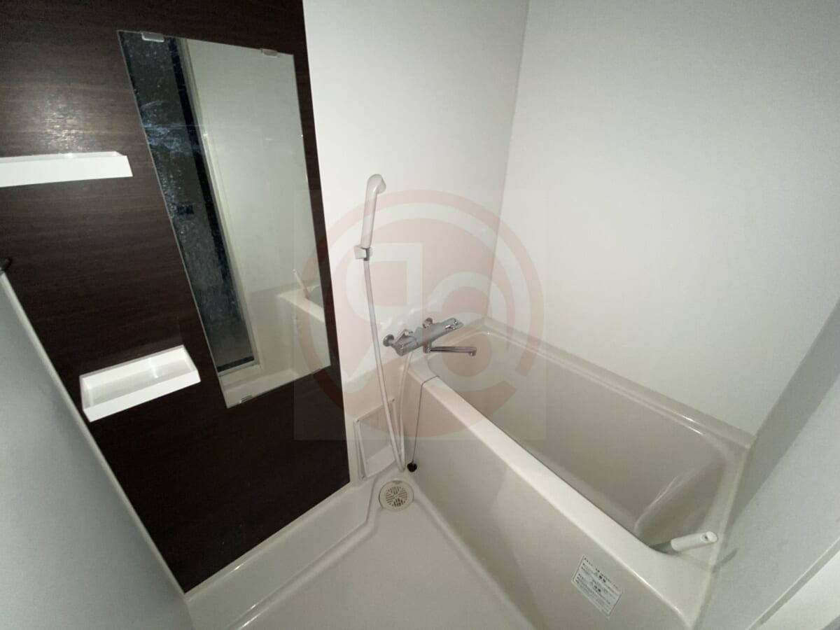 バスルームはブラウンのアクセントウォールが落ち着いた空間で、毎日の入浴を快適にサポートしてくれます。掃除もしやすく、清潔感を保ちやすい点が魅力。浴槽は一人暮らしにちょうど良いサイズ感で、肩までしっかり浸かれるため、日々の疲れを癒すリラックスタイムを確保できます。シンプルだからこそ、バスグッズや小物で自分好みの空間にアレンジしやすいのもポイントです◎