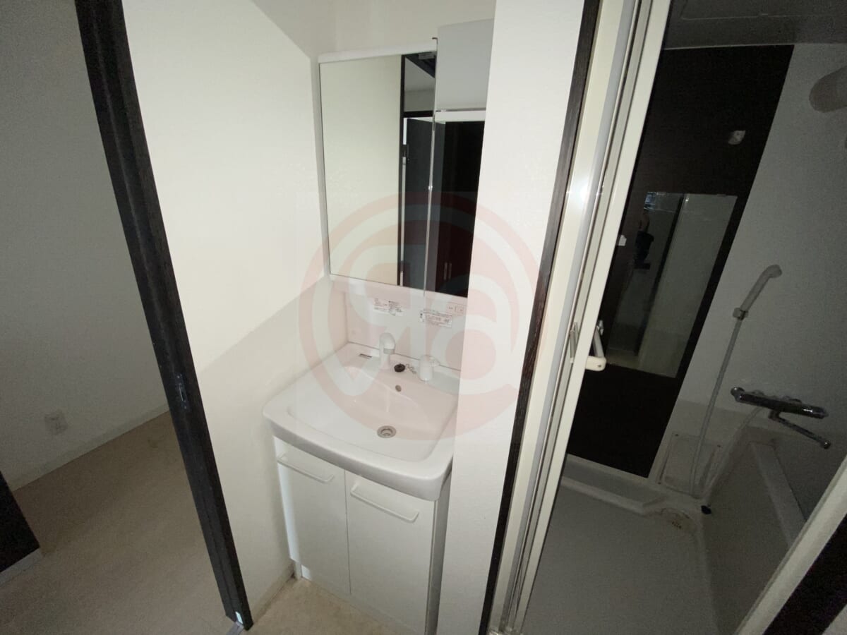 脱衣室には独立洗面台と洗濯機置き場を完備。独立洗面台は、白基調で清潔感があり、鏡裏収納付きなので物が出しっぱなしになることがありません。デザイン性の高さだけでなく、使い勝手にも配慮されており、朝の準備や帰宅後も快適です。洗濯機置き場もゆったりと確保されており、ストレスなく日常家事がこなせます。コンパクトながらも効率的に設計された空間で、日々の家事動線をスムーズにしてくれます◎