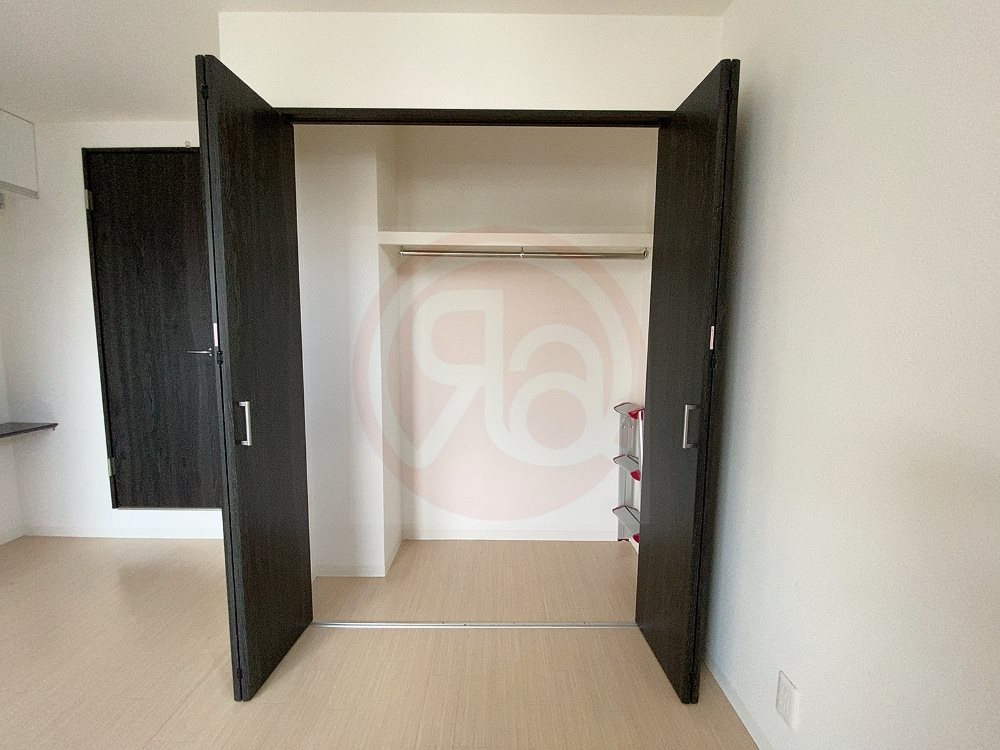 クローゼットは奥行きのあるワイドタイプで、必要な荷物を十分に収納できるサイズ感で、衣類だけでなく、スーツケースや掃除用具、シーズンオフの家電などもしっかりしまえるので、室内をすっきりと保てます。限られた空間を有効活用できる収納は、一人暮らしでも収納力重視の方にとってうれしいポイントです◎