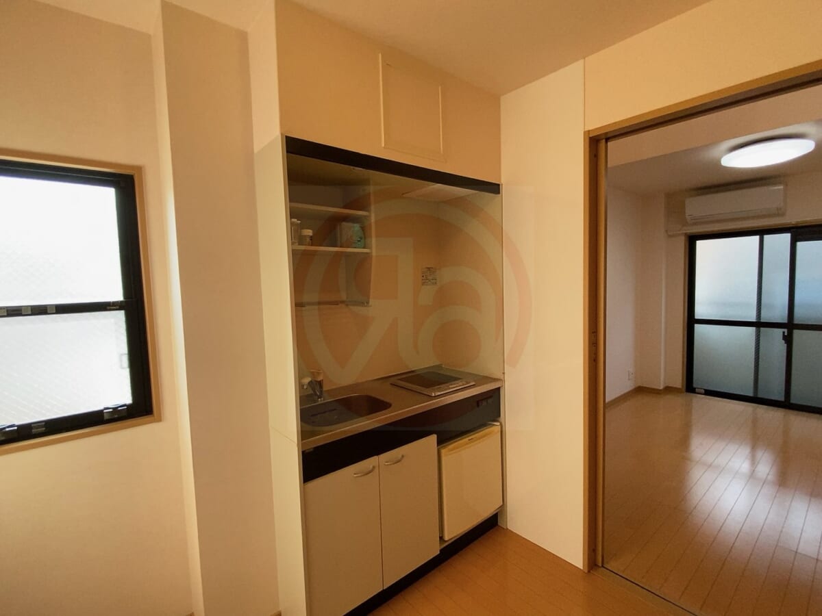 キッチンは1口IHコンロで、火を使わない安心設計なので、調理器具の焦げ付きも少なく、掃除も簡単です。さらに、ミニ冷蔵庫があらかじめ設置されているため、引っ越し時に新たに購入する手間も不要。一人暮らし初心者や自炊は最低限でOKという方にもぴったりの、コンパクトながら実用的なキッチンです。