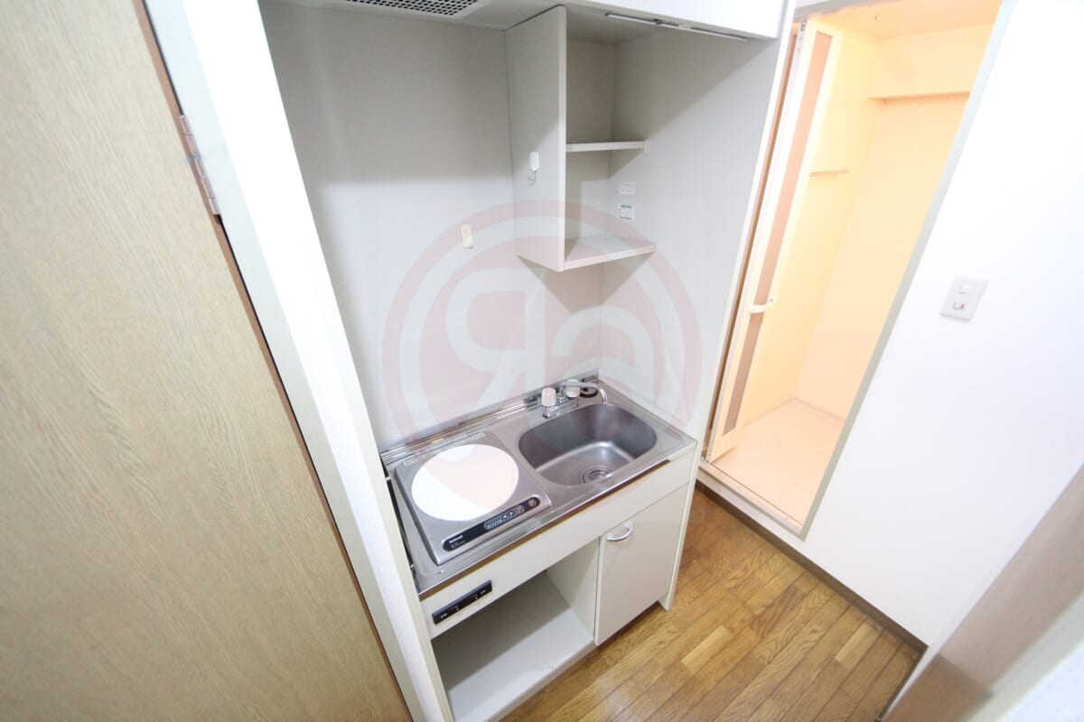 キッチンは1口IHコンロで、火を使わない安心設計なので、調理器具の焦げ付きも少なく、掃除も簡単です。調理スペースはありませんが、作業台代わりになるラックやシンク上トレーなどで工夫すれば、簡単な自炊にも対応可能です。出張が多く外食中心の方や、軽めの自炊しかしない方にはちょうどいい仕様です。