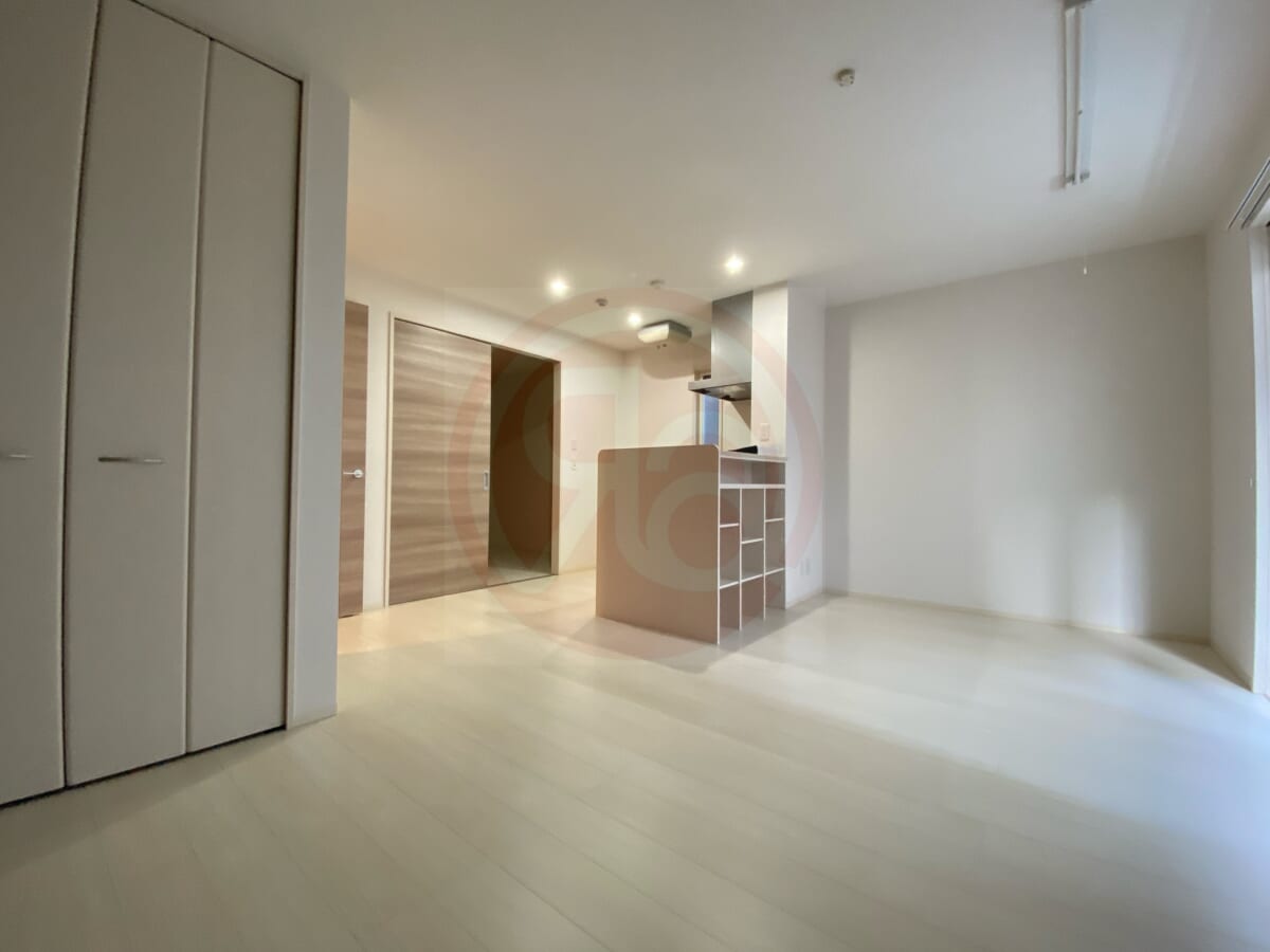 LDKは約12.6帖と、1LDKの中でも広さに余裕のある設計で、リビングとダイニングをしっかり分けてレイアウトできるため、ソファやダイニングテーブルを置いても圧迫感が出にくいのが特徴です。南向きバルコニーに面しており、日中は自然光が室内まで入り、1階でありながら明るい空間を実現。キッチンとの動線も良く、料理をしながらリビング全体を見渡せるため、生活の一体感が生まれます。