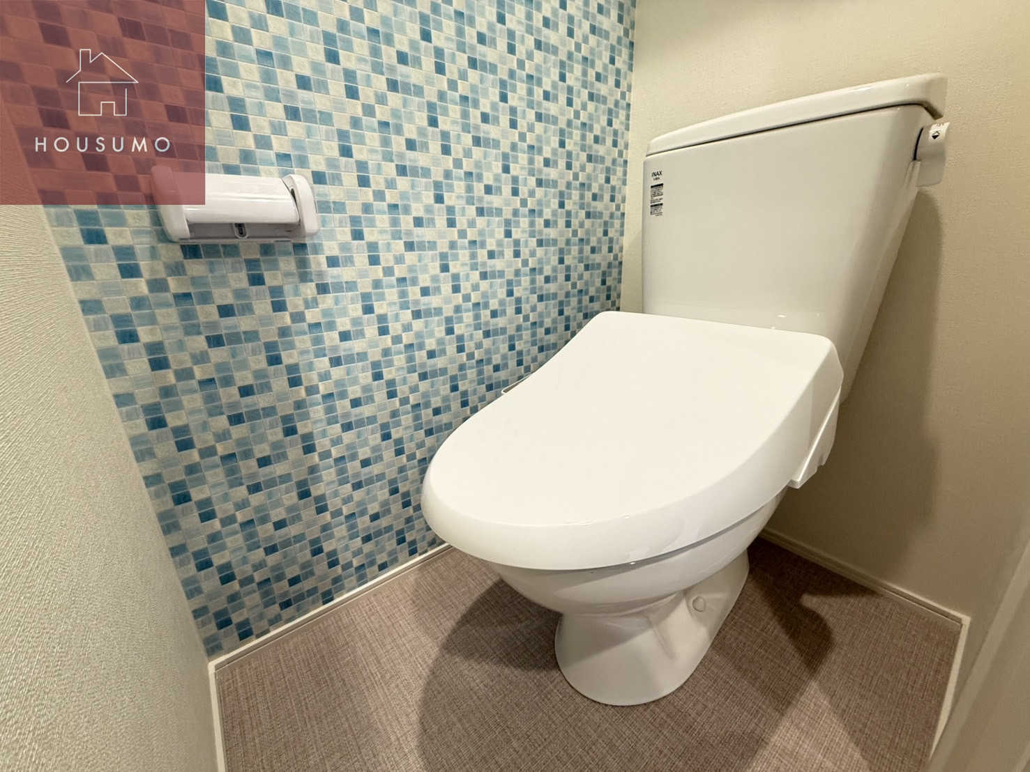 トイレは独立タイプで、落ち着いて使える空間が確保されています。一面に施された、いろんな青のタイル柄の壁が空間のアクセントになっています。爽やかでかわいらしいデザインのため、毎日使う場所でも気分が上がります。シンプルになりがちなトイレ空間に、さりげないデザイン性をプラスしています。タイル調の壁は汚れが目立ちにくく、お手入れしやすい点も魅力です。来客時にも印象に残りやすく、細部までこだわりを感じられます。機能性とデザイン性を兼ね備えた、使うたびに心地よさを感じるトイレです。