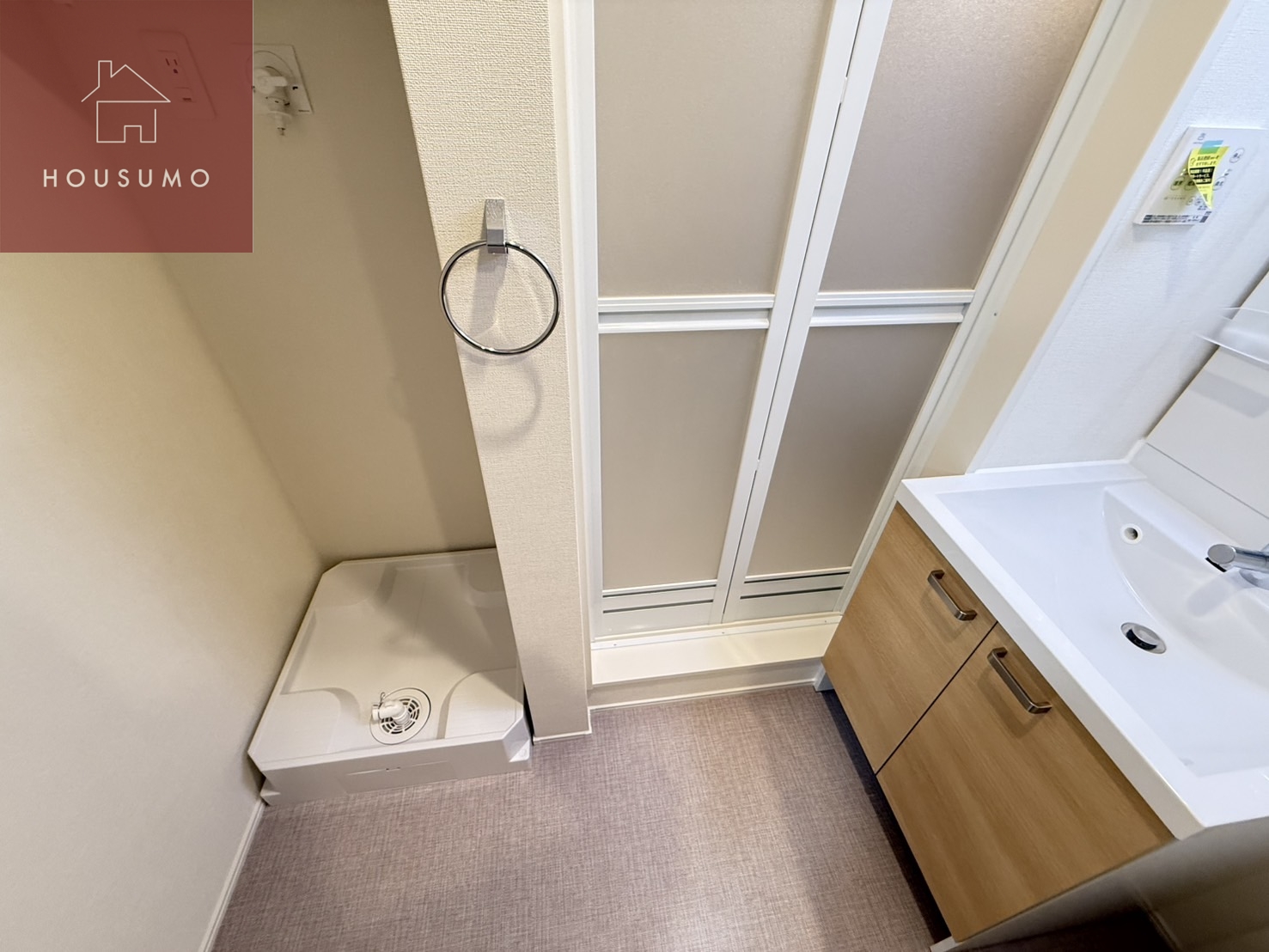 独立洗面台を備えた脱衣所があり、身支度や入浴前後の動作がスムーズに行えます。洗面と脱衣スペースが分かれているため、生活感が出にくく使いやすい設計です。朝の身支度や帰宅後の手洗いなど、日常的に利用しやすい動線が確保されています。室内洗濯機置き場が近く、洗濯から干すまでの流れも効率的です。小物や洗剤を置くスペースを確保しやすく、整理整頓がしやすい点も魅力です。二人入居でも使うタイミングが重なりにくく、ストレスを感じにくい空間です。毎日の暮らしを快適に支えてくれる、実用性の高い脱衣所となっています。