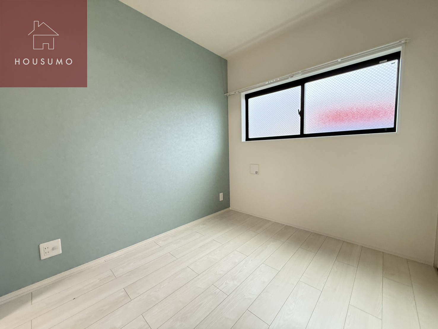 室内には水色のおしゃれなアクセントクロスが施されており、空間全体を明るく爽やかな印象に演出しています。淡い水色の壁紙は圧迫感がなく、部屋を広く見せてくれる効果も期待できます。シンプルながらもデザイン性があり、インテリアのテイストを選ばず合わせやすい点が魅力です。ナチュラル系や北欧テイストの家具とも相性が良く、自分らしい空間づくりを楽しめます。アクセントクロスがあることで、賃貸物件でも個性を感じられる住まいになります。落ち着きのある色合いのため、寝室や書斎としても使いやすい空間です。デザイン性と住みやすさを両立した、こだわりを感じる室内仕様となっています。