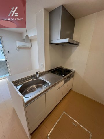 料理をしながらリビングの様子を見渡せる、人気のカウンターキッチンを採用しています。三口コンロを搭載したシステムキッチンは、複数の料理を同時に進められるため、自炊派の方や二人入居のご家庭にとっても非常に機能的です。白を基調とした清潔感のあるデザインに、お手入れのしやすいステンレス天板を組み合わせ、スタイリッシュで使い勝手の良い空間に仕上がっています。背後には冷蔵庫やカップボードを置くスペースも十分に確保されており、毎日の家事がスムーズに楽しくなりそうな、ゆとりある設計が魅力のお部屋です。