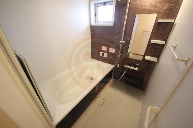 ブラウンの石目調アクセントパネルが高級感を演出するバスルームは、1.6m×2.0m以上の広々としたサイズが確保されており、毎日の疲れをゆったりと癒やすことができます。バスタブの横には小窓が設置されているため、自然光を取り入れながら開放的な気分で入浴を楽しめるほか、効率的な換気が行えるのも嬉しいポイントです。追い炊き機能に加えて浴室乾燥機も完備されており、天候や時間を気にせず洗濯物を乾かせるなど、分譲賃貸ならではの機能的な設備が充実しています。ホワイトを基調とした清潔感のある空間に、使いやすいシャワーヘッドや収納棚がスマートに配置されており、快適さと美しさを両立した贅沢なバスタイムを提供してくれるお部屋です。